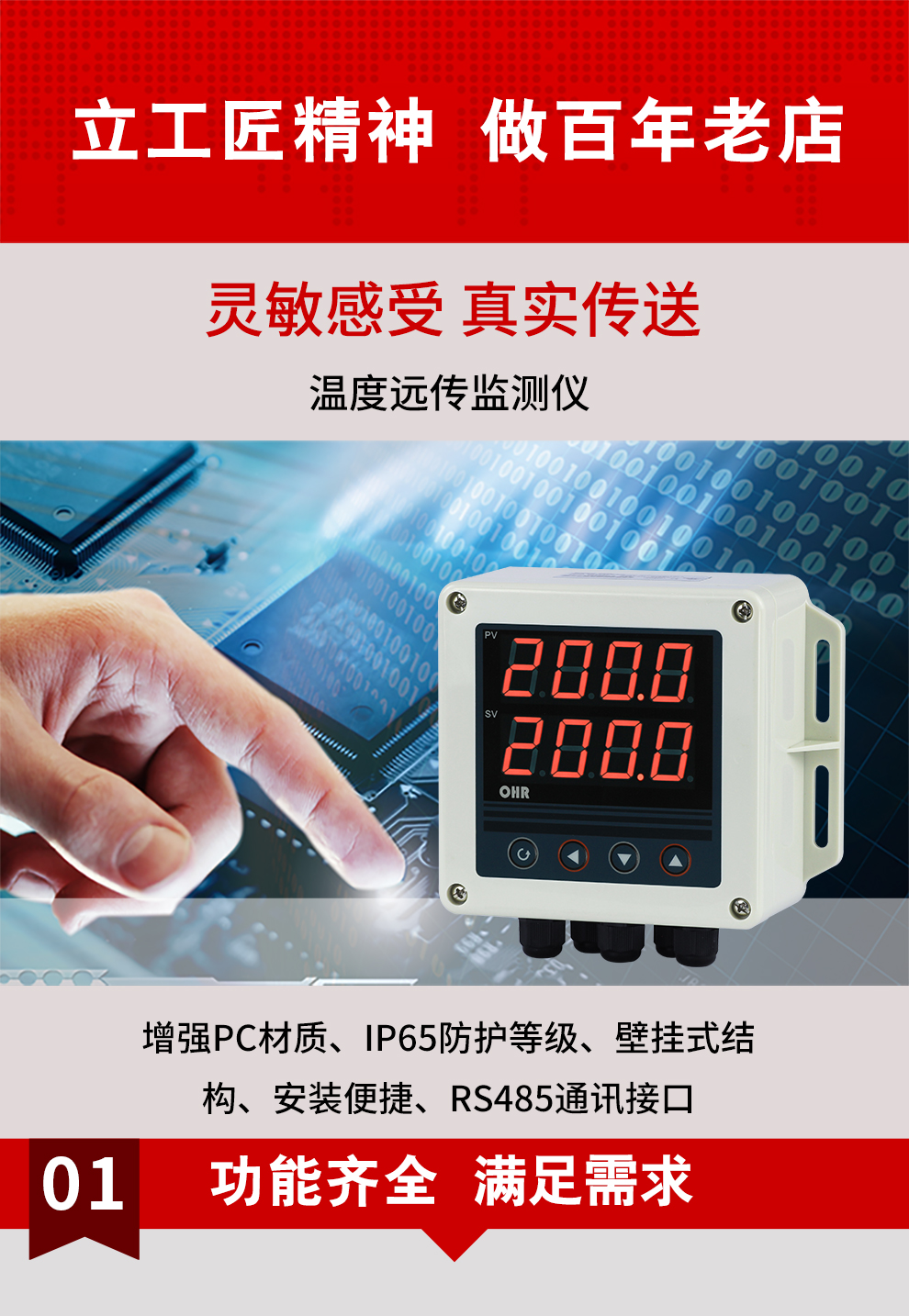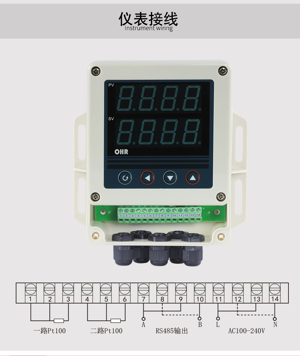 OHR-XTRT系列溫度遠傳監測儀采用了表面貼裝工藝,全自動貼片機生產,具有很強的抗干擾能力。本儀表支持兩路PT100輸入,實現對溫度物理的測量顯示,帶RS485通訊輸出功能,帶雙屏數碼管顯示,上窗口顯示第1路測量值,下窗口顯示第2路測量值。