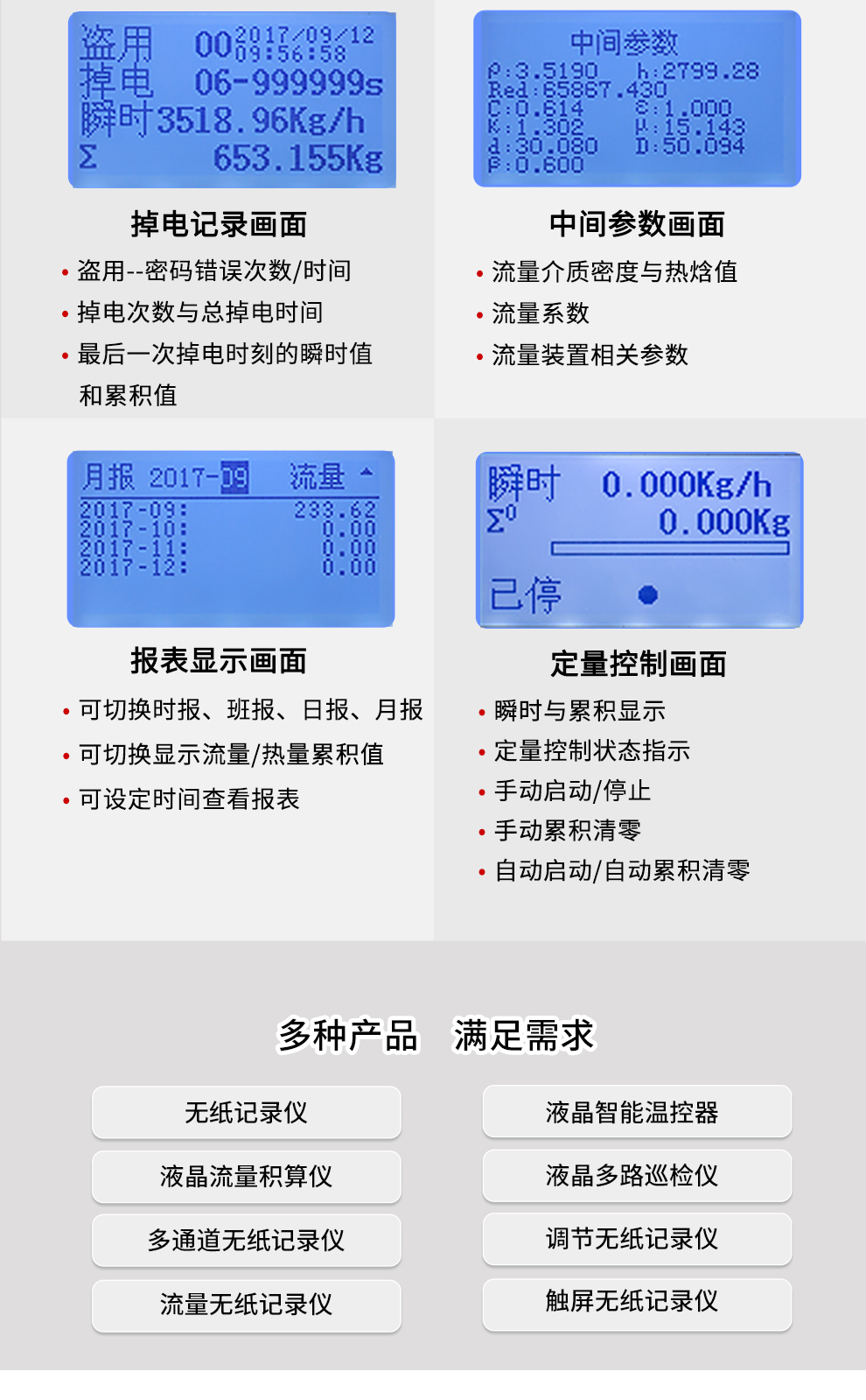 無紙記錄儀 液晶無紙記錄儀 液晶智能溫控器 液晶手動操作器 液晶流量積算儀 液晶容積記錄儀 液晶多路巡檢儀 液晶天然氣積算儀 彩色無紙記錄儀 彩色調節無紙記錄儀 彩色流量無紙記錄儀 觸摸彩色無紙記錄儀 觸摸彩色調節無紙記錄儀 觸摸彩色流量無紙記錄儀 觸摸屏數顯表 觸摸屏流量儀 觸摸屏溫控器