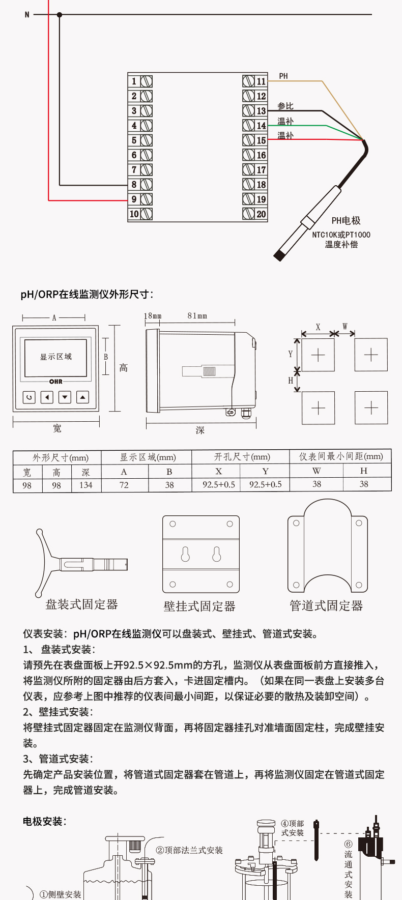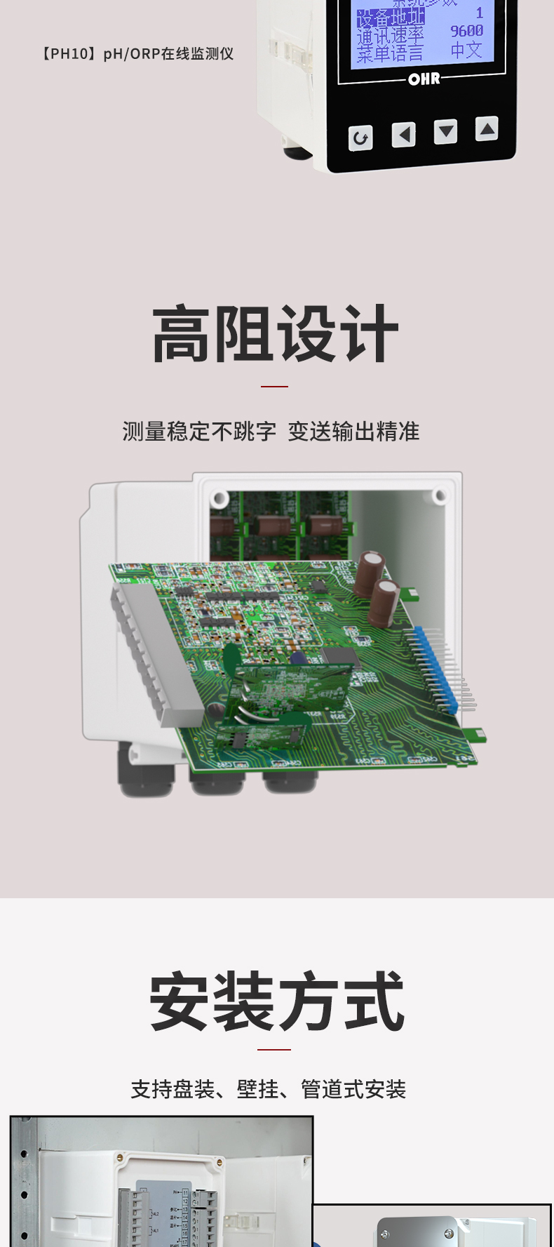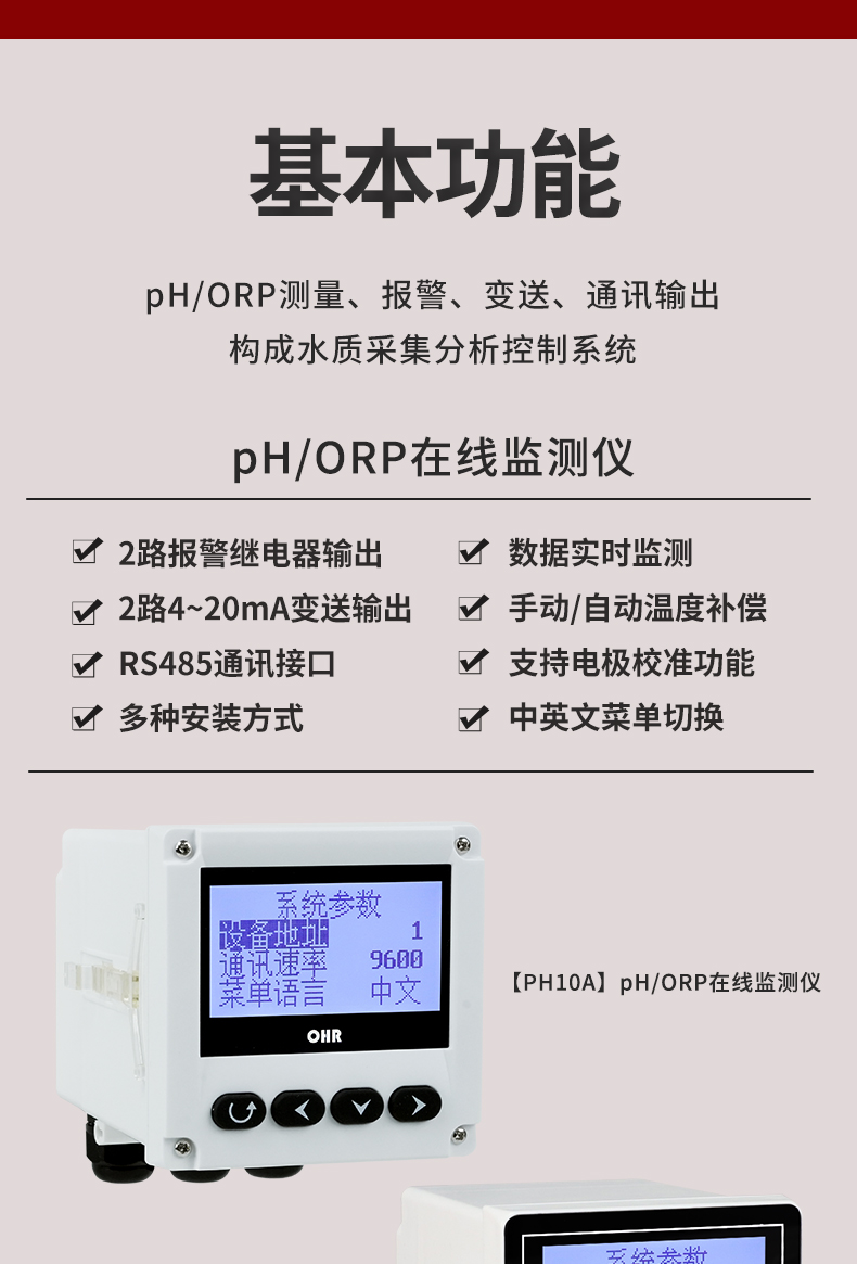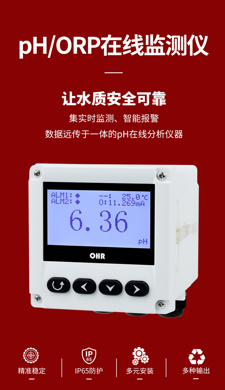 OHR-PH10A系列pH/ORP在線監測儀是一款智能在線化學分析儀器(酸度計、pH計、pH酸度計、酸度計phs-25),具備一路RS485通訊輸出、一路模擬信號輸出和兩路繼電器報警輸出。廣 泛應用于環保水處理、純凈水、循環水、鍋爐水等系統以及電子、電鍍、印染、化學、食品、制藥等制程 領域。