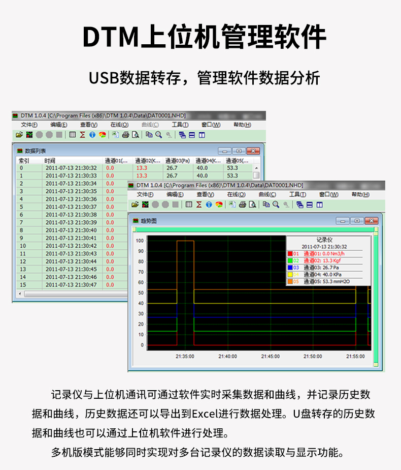 NHR-DN50系列導軌無紙記錄儀采用2.2英寸點陣式液晶顯示,帶LED背光;顯示功能強大,具有實時曲線畫面、數顯畫面、歷史追憶畫面、備份畫面。儀表采用主副機結構設計,主機可提供4路萬能信號輸入,通道間相互隔離;4限報警輸出、4路變送輸出,饋電輸出、RS485通訊、以太網通訊等功能,連接副機可將I/O容量擴展至8路輸入和8限報警輸出、8路變送輸出。帶USB數據轉存功能,存儲時間最長可達5825天。