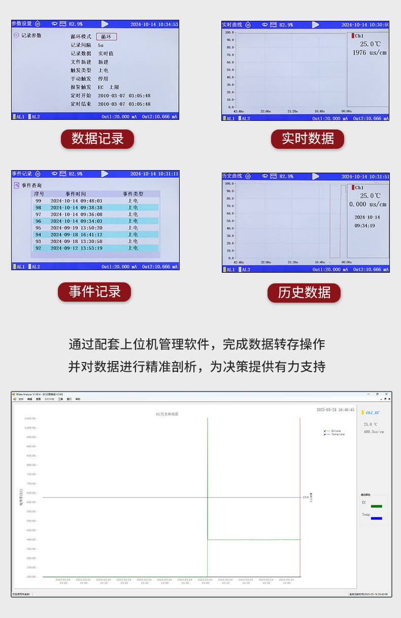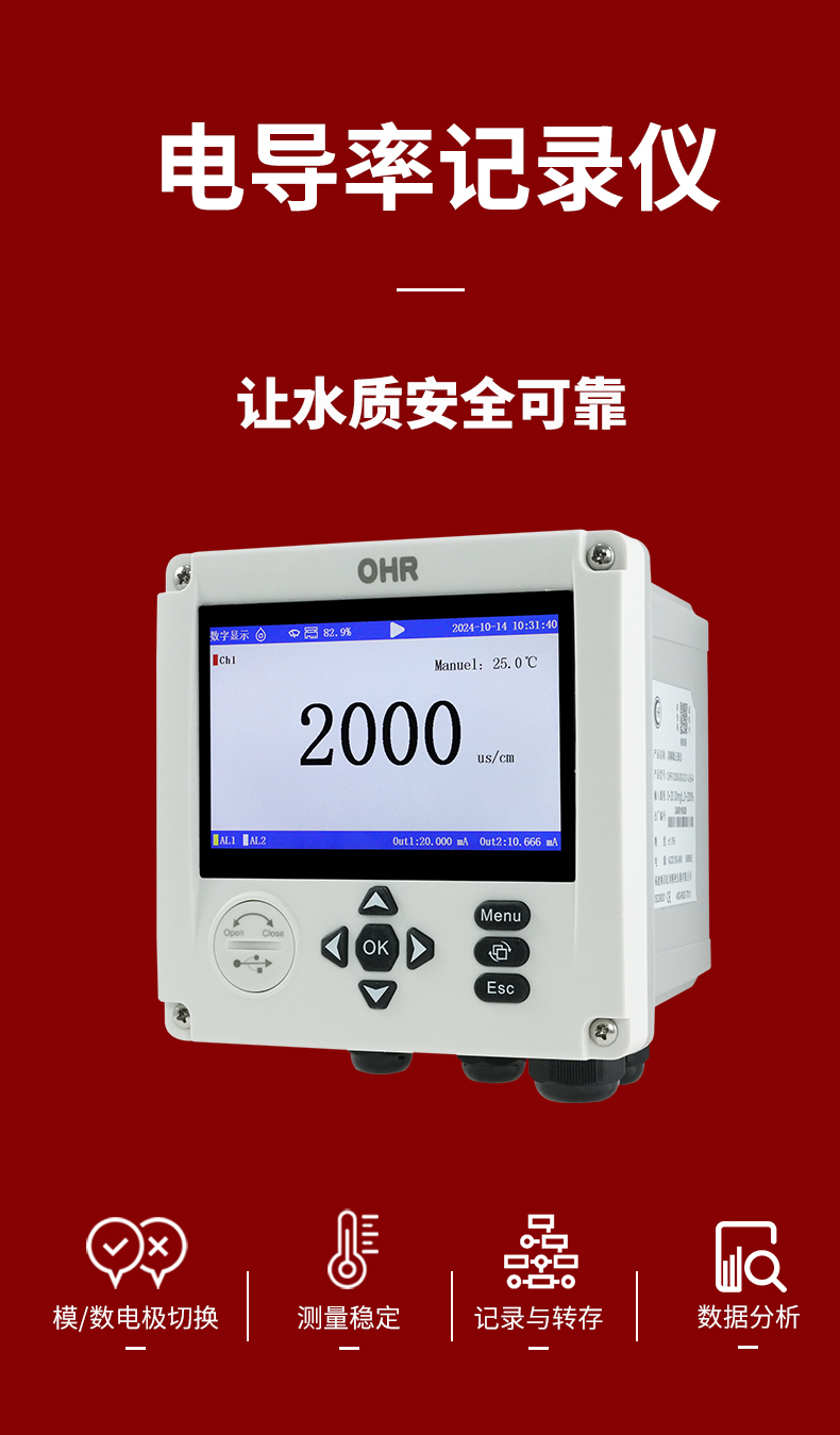 OHR-EC80系列電導率記錄儀是一款在線化學分析記錄控制器,可對工業用水的電導率 /TDS值進行連續測量和控制。記錄儀具有兩路模擬信號輸出、兩路繼電器報警輸出以及 RS485/以太網通訊輸出等功能,方便用戶進行數據傳輸和監控。具有強大的顯示功能,使用戶能夠清晰地了解系統運行情況。