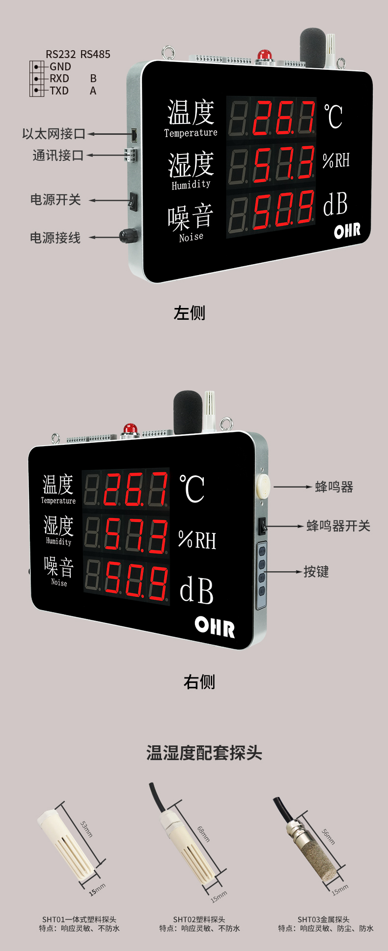 OHR-WS55系列大屏噪音溫濕度記錄儀采用高精度的采集電路及進(jìn)口傳感器,對環(huán)境的噪音、溫濕度等進(jìn) 行實(shí)時(shí)監(jiān)測、報(bào)警與記錄。本產(chǎn)品采用鋁合金邊框,高品質(zhì)亞克力面板,外觀美觀大方;大屏幕LED數(shù)碼 管顯示,醒目、便捷,實(shí)時(shí)顯示噪音值和溫濕度值等信息;可選配RS485、RS232通訊接口或以太網(wǎng)通訊接 口,通過配套的上位機(jī)軟件讀取歷史記錄。該產(chǎn)品適用于多種場合,尤其適用于倉庫、車間、畜牧業(yè)中室 內(nèi)環(huán)境溫濕度的監(jiān)測。